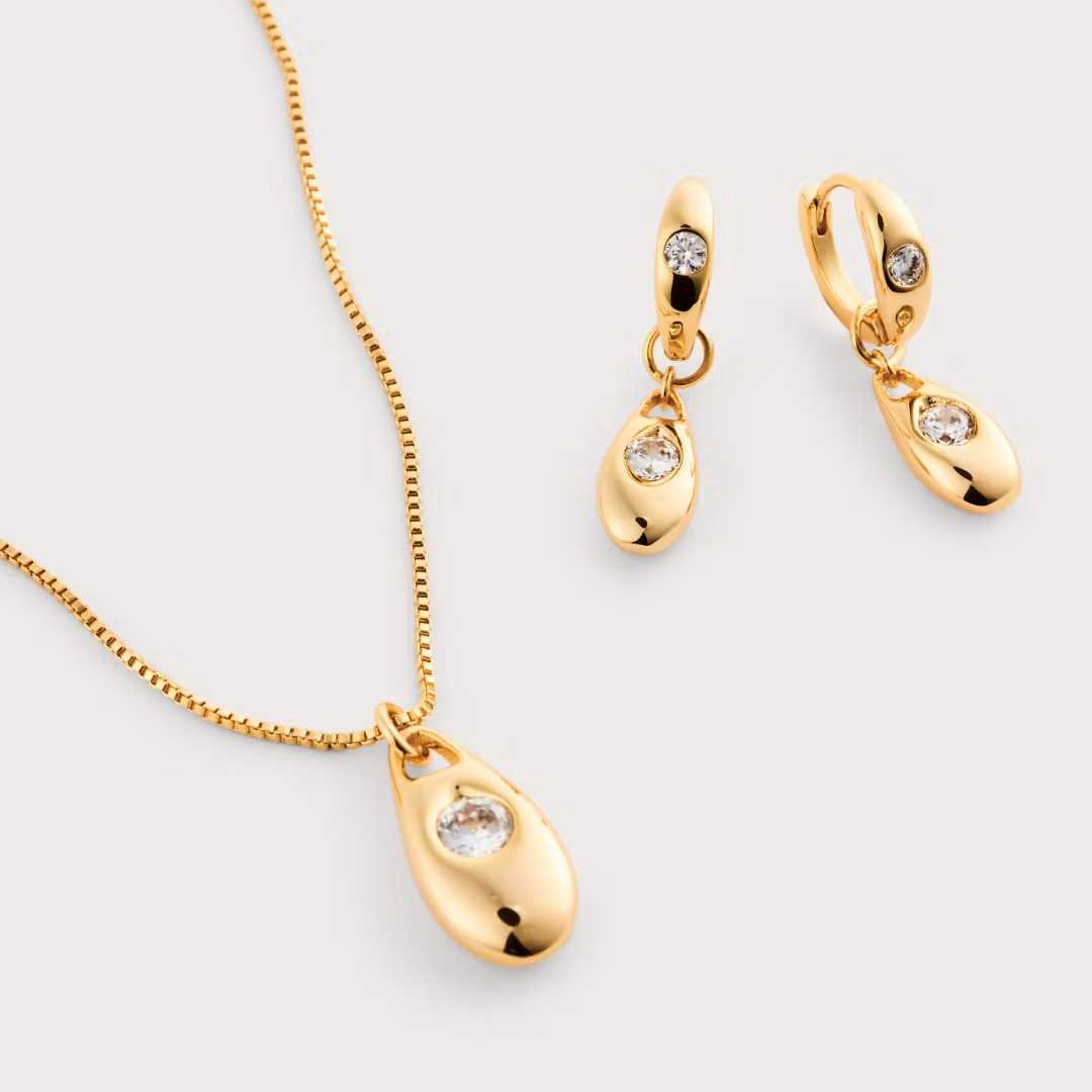 Dieses Combo enthält die Still Here Halskette und die Soft Honey Ohrringe. Zwei Schmuckstücke mit handgefassten Zirkonen in klarem Design, leicht zu tragen und leicht zu lieben.